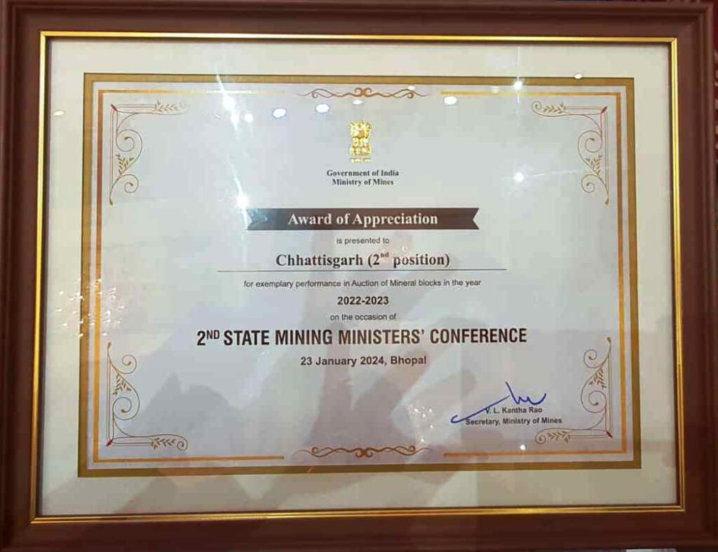 केन्द्रीय कोयला एवं खान मंत्री श्री प्रहलाद जोशी ने आज मध्यप्रदेश की राजधानी भोपाल में आयोजित राज्य खनन मंत्री सम्मेलन में गैर कोयला मुख्य खनिज ब्लॉकों की सफलतापूर्वक नीलामी के लिए छत्तीसगढ़ को देशभर में द्वितीय बेस्ट परफॉर्मेंस अवार्ड से नवाजा है। यह पुरस्कार भारत सरकार के खनन मंत्रालय द्वारा दिया गया है। मुख्यमंत्री श्री विष्णु देव साय ने इस उपलब्धि के लिए खनिज विभाग के सभी अधिकारियों को बधाई और शुभकामनाएं दी हैं।