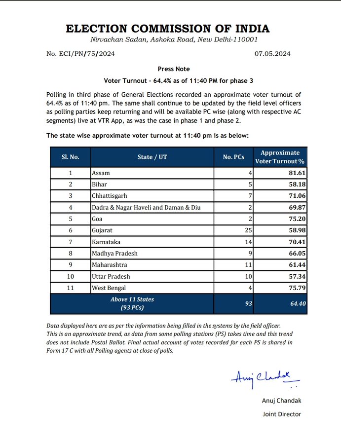 लोकसभा चुनाव के तीसरे चरण में मंगलवार को एक बार फिर 60 फीसदी से ज्यादा मतदान की सूचना है। चुनाव आयोग ने बताया कि रात आठ बजे तक प्राप्त आंकड़ों के अनुसार 11 राज्यों एवं केंद्रशासित प्रदेशों की 93 सीटों पर 64.40 % प्रतिशत मतदान हुआ। आयोग ने बताया कि चुनाव शांति पूर्ण रहा। हालांकि, सुबह पश्चिम बंगाल से हिंसा की छिटपुट खबरें प्राप्त हुई थीं।चुनाव आयोग की तरफ से दी गई जानकारी के मुताबिक, रात 8 बजे तक सबसे ज्यादा 75.26 प्रतिशत मतदान असम में होने की सूचना है। वहीं, महाराष्ट्र में सबसे कम 54.77 फीसदी मतदाताओं ने वोट डाले। गोवा में 74.27 प्रतिशत और पश्चिम बंगाल में 73.93 प्रतिशत मतदान हुआ। कर्नाटक में 67.76 फीसदी, छत्तीसगढ़ में 66.99 फीसदी, दादर एवं नागर हवेली और दमन एवं दीव में 65.23 फीसदी और मध्य प्रदेश में 63.09 फीसदी मतदान हुआ। उत्तर प्रदेश से 57.34 प्रतिशत, गुजरात से 56.76 प्रतिशत और बिहार से 56.55 प्रतिशत मतदान की खबर है।