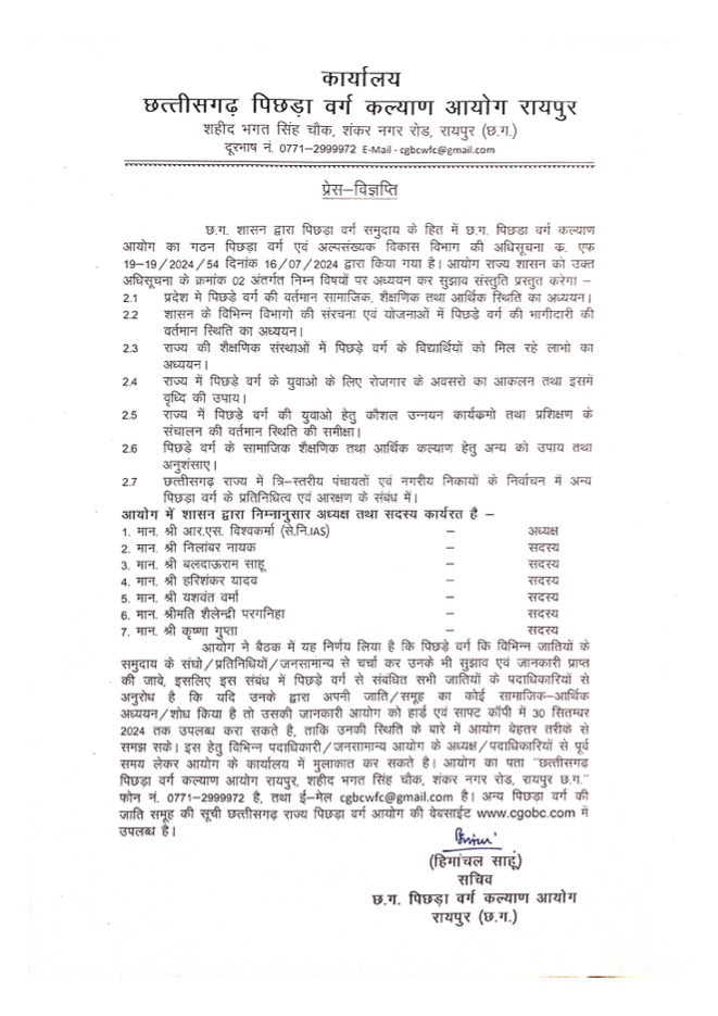 गौरतलब है कि छत्तीसगढ़ शासन द्वारा पिछड़ा वर्ग समुदाय के कल्याण के लिए छत्तीसगढ़ पिछड़ा वर्ग कल्याण आयोग का गठन किया गया है। इस आशय के अधिसूचना छत्तीसगढ़ राजपत्र में 27 जून 2020 को प्रकाशित भी की गई है। राज्य में अन्य पिछड़ा वर्ग में कुल 87 जाति समूह को शामिल किया गया है, जिसकी सूची छत्तीसगढ़ राज्य पिछड़ा वर्ग आयोग की वेबसाईट ूूूण्बहवइबण्बवउ में उपलब्ध है। शासन द्वारा आयोग के उद्देश्य को आगे बढ़ाने के लिए श्री आर.एस. विश्वकर्मा को अध्यक्ष, श्री निलाम्बर नायक, श्री हरिशंकर यादव, श्री यशवंत वर्मा, श्री कृष्णा गुप्ता, श्रीमती शैलेन्द्री परगनिहा को सदस्य मनोनीत किया है। आयोग के अध्यक्ष श्री आर.एस. विश्वकर्मा की अध्यक्षता में बैठक आयोजित कर आयोग द्वारा राज्य शासन को उक्त अधिसूचना के क्रमांक 02 अंतर्गत पिछड़ा वर्ग समूहों के आर्थिक, सामाजिक, शैक्षणिक और राजनैतिक सहित अन्य विषयों पर अध्ययन कर शासन को सुझाव प्रस्तुत करने का निर्णय लिया गया है।