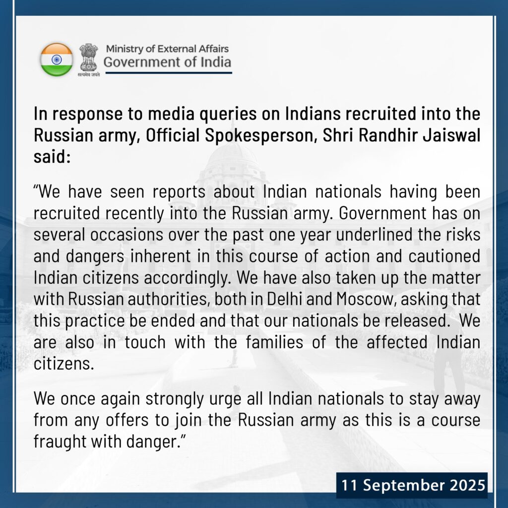विदेश मंत्रालय के प्रवक्ता रणधीर जायसवाल ने बताया कि सरकार को ऐसी जानकारी मिली है कि कुछ भारतीय नागरिक रूसी सेना में भर्ती हुए हैं। उन्होंने कहा कि सरकार पिछले एक साल से इस बारे में लगातार लोगों को आगाह कर रही है।